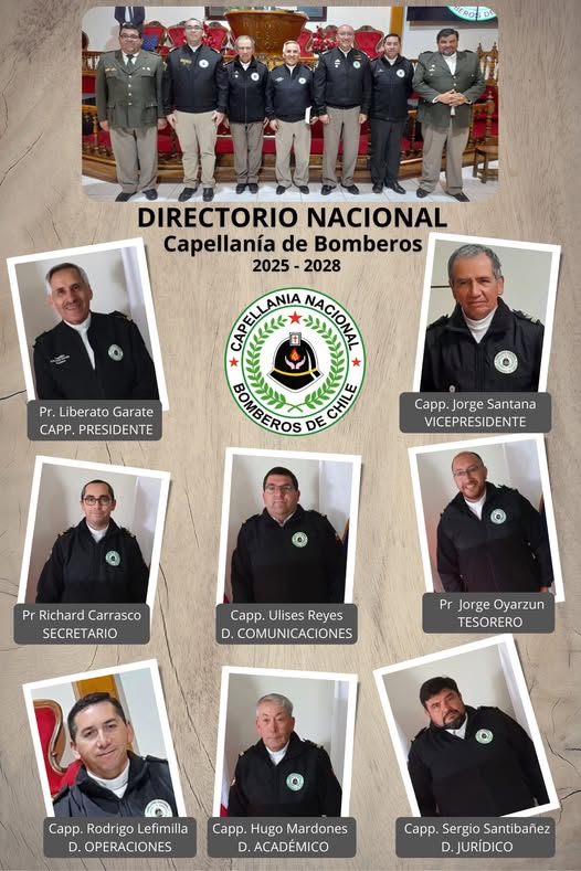 La Capellanía Nacional de Bomberos de Chile es la Asociación de Capellanes que funda su Ministerio desde el ceno de la Institución Bomberil, Reconociendo y Agrupando a los Capellanes de las Compañías y Cuerpos distribuidas en todo Chile, Y tiene como tarea Alentar y Potenciar el trabajo de una multitud de voluntarios que profesan su Fe en forma privada y son parte de los Cuerpos de Bomberos de Chile. Que a su vez tienen como finalidad asistir espiritualmente a los hombres y mujeres que conforman esta reconocida Institución, sin distinción de grado ni escalafones y a la dotación de los diferentes estamentos Institucionales, sus familias y víctimas de incidentes y catástrofes.